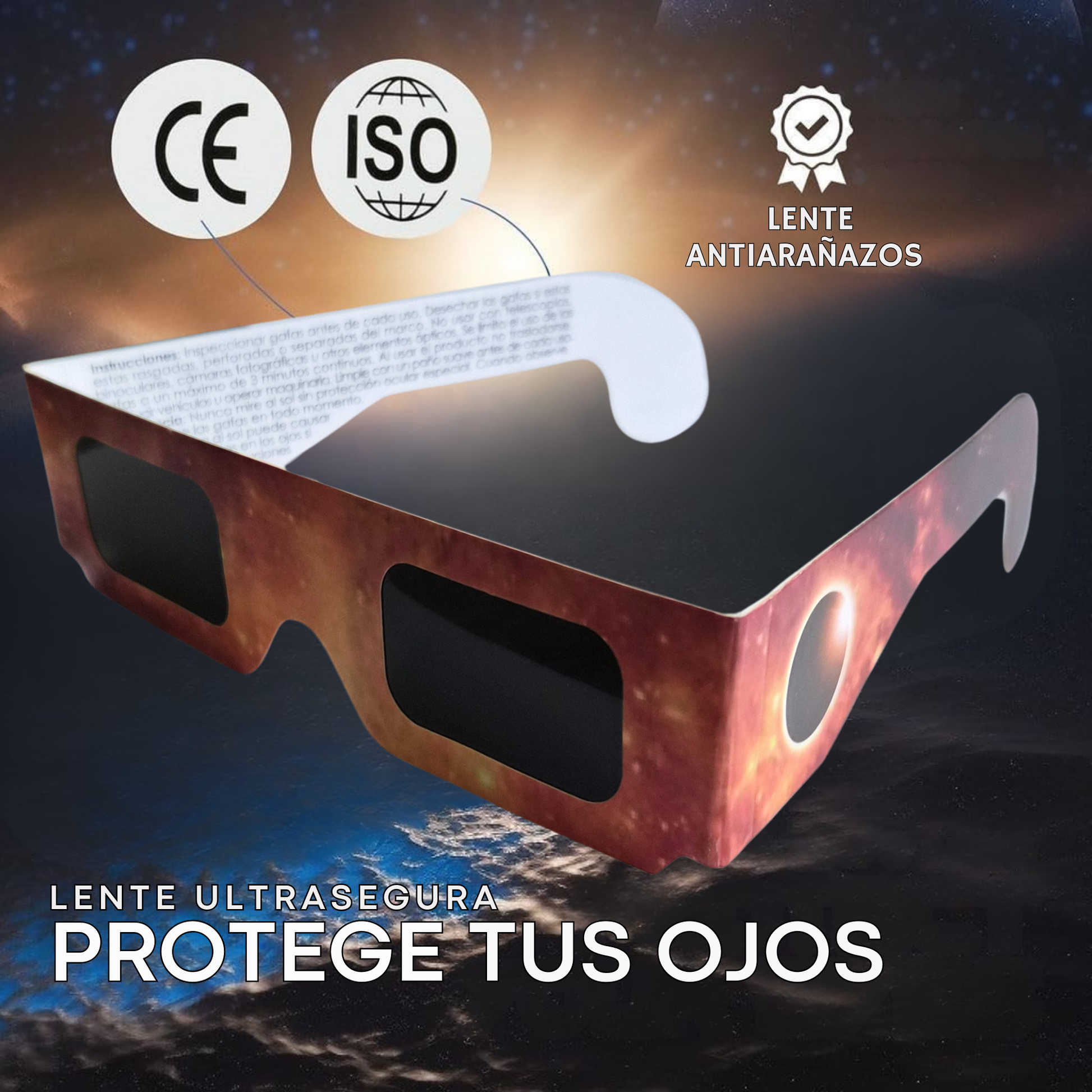 USO RESPONSABLE — No son gafas de sol comunes ni sirven como filtro de soldadura. Revisa las lentes antes de cada uso; si están rayadas o sueltas, descártalas. Ponte las gafas antes de mirar al Sol y retíralas después de apartar la vista. Supervisión adulta obligatoria en niños.